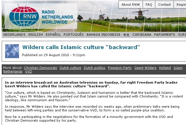 5. The mass media likes to make fun of blogs, but at least blogs sometimes check the original source. In this case, RNW simply translated from the Dutch translation of Wilders interview:
