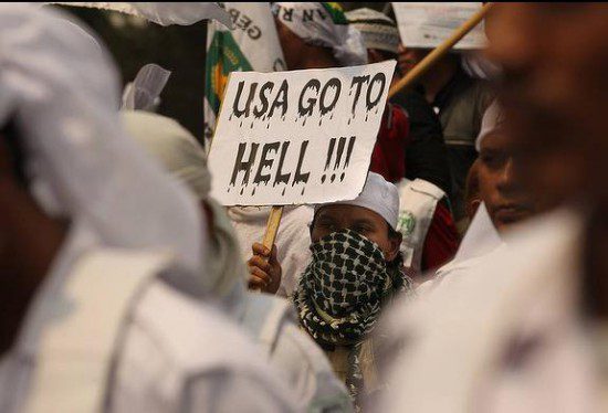 A man holds a sign “USA GO TO HELL” as he joins hundreds of protestors gathered for anti US protests at the Bunderan Hotel in Central Jakarta, Indonesia. (Brisbane Times)