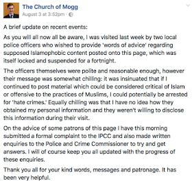 As you will all now all be aware, I was visited last week by two local police officers who wished to provide ‘words of advice’ regarding supposed Islamophobic content posted onto this page, which was itself locked and suspended for a fortnight.The officers themselves were polite and reasonable enough, however their message was somewhat chilling: it was insinuated that if I continued to post material which could be considered critical of Islam or offensive to the practices of Muslims, I could potentially be arrested for ‘hate crimes.’Equally chilling was that I have no idea how they obtained my personal information and they weren’t willing to disclose this information during their visit.On the advice of some patrons of this page I have this morning submitted a formal complaint to the IPCC and also made written enquiries to the Police and Crime Commissioner to try and get answers.I will of course keep you all updated with the progress of these enquiries.Thank you all for your kind words, messages and patronage. It has been very helpful.